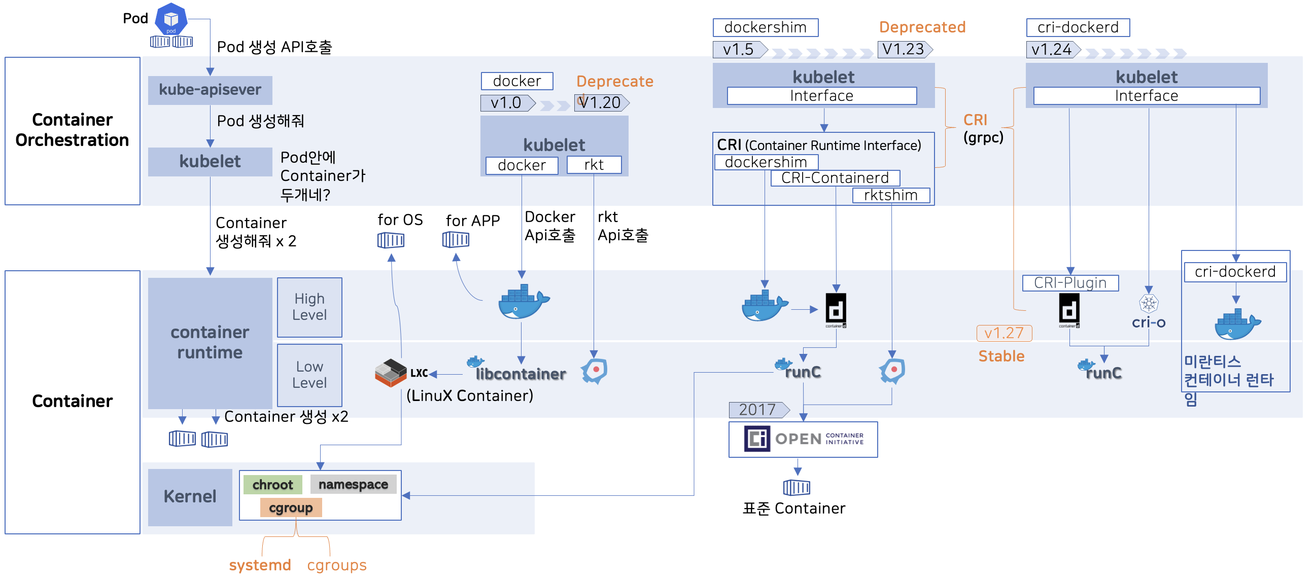 초창기 쿠버네티스에서의 kubelet 은 컨테이너 런타의 종류에 따라 맞춤형 API 를 호출하게 만들어져 있었다.