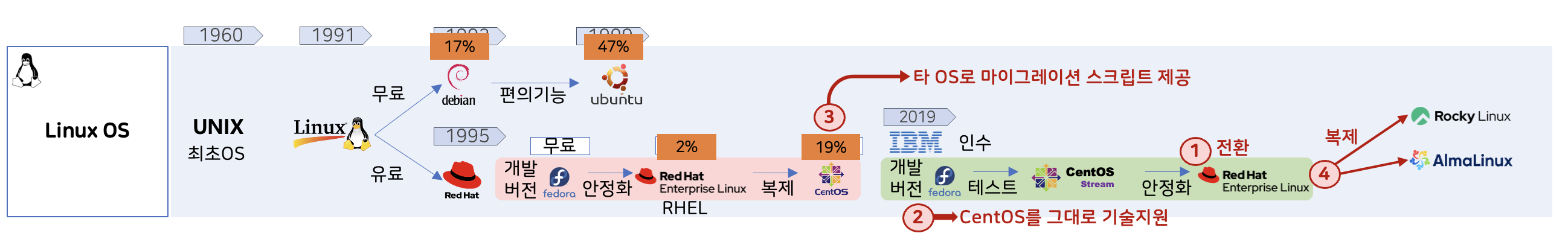 - Rocky, Alma 등 새롭게 출시된 레드햇 복제 리눅스로 전환